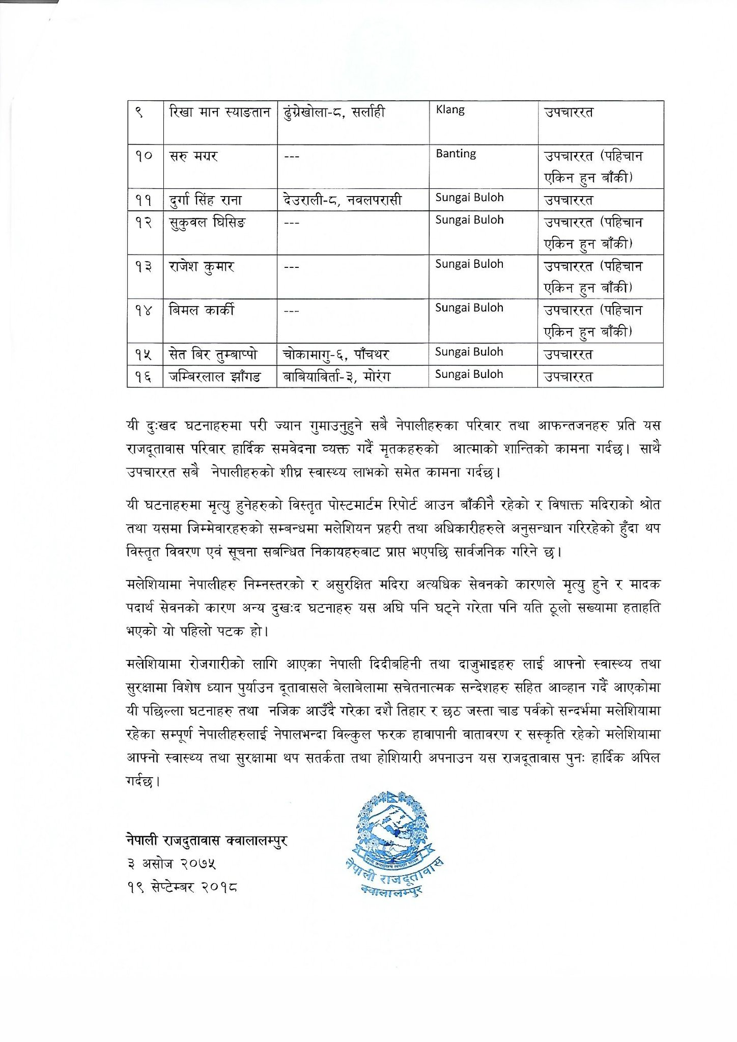 मृत्यु हुनेहरुको पोष्टमार्टम रिपोर्ट आउन बाँकी रहेको र थप अनुसन्धान मलेसियन प्रहरीले गरिरहेको मलेसियास्थित नेपाली दुतावासले एक प्रेस विज्ञाप्ति जारी गर्दै जनाएको छ ।