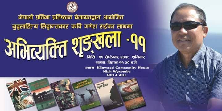 काठमाडौँ, ४ असोज – नेपाली प्रतिभा प्रतिष्ठान बेलायतले बर्सेनी आयोजना गर्दै आएको लोकप्रिय कार्यक्रम ‘अभिव्यक्ति शृङ्खला’को एघारौँँ संस्करणमा युद्धसाहित्य सिद्धान्तकार, साहित्यकार तथा कवि गणेश राई प्रस्तुत हुने भएका छन् । सेप्टेम्बर २२ तारिक शनिबारका दिन लन्डननजिकै हाईवेकमको क्लिनउड कम्युनिटी हाउसमा आयोजना हुने भव्य समारोहमा कवि राई आफ्नो दर्जन बढी युद्धकविता र युद्धसाहित्य अवधारणासहित प्रस्तुत हुनेछन् । राईका कविता संग्रह ‘राईफलले फलाकेको जिन्दगी’ तथा तीन वटा उपन्यास ‘राईफलको नालबाट जीवन नियाल्दा,’ ‘युद्ध एम्बुसमा राईफलको संगीत’, ‘राईफलको मूच्र्छना’ र ‘फोकल्यान्ड जर्नल’ कृति प्रकाशित छन् ।