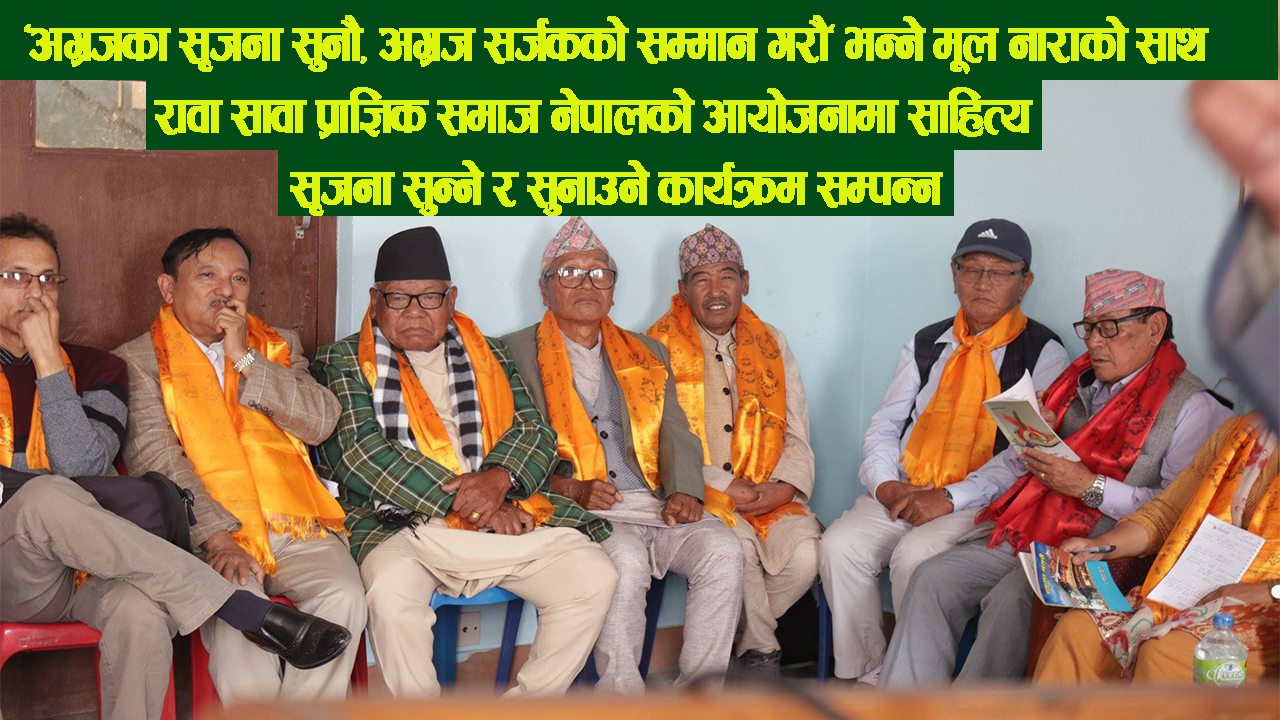 ईन्द्र जिजीबिषा / काठमाडौ – “अग्रजका सृजना सुनौ, अग्रज सर्जकको सम्मान गरौ” भन्ने मूल नाराको साथ रावा सावा प्राज्ञिक समाज नेपालको आयोजनामा साहित्य सृजना सुन्ने र सुनाउने कार्यक्रम सम्पन्न भएको छ । कोटेश्वर स्थित ग्रामर कलेजको हलमा सम्पन्न कार्यक्रममा १४ जना भन्दा बढी अग्रज सर्जकहरुले आ-आफ्ना सृजनाहरु सुनाएका थिए ।