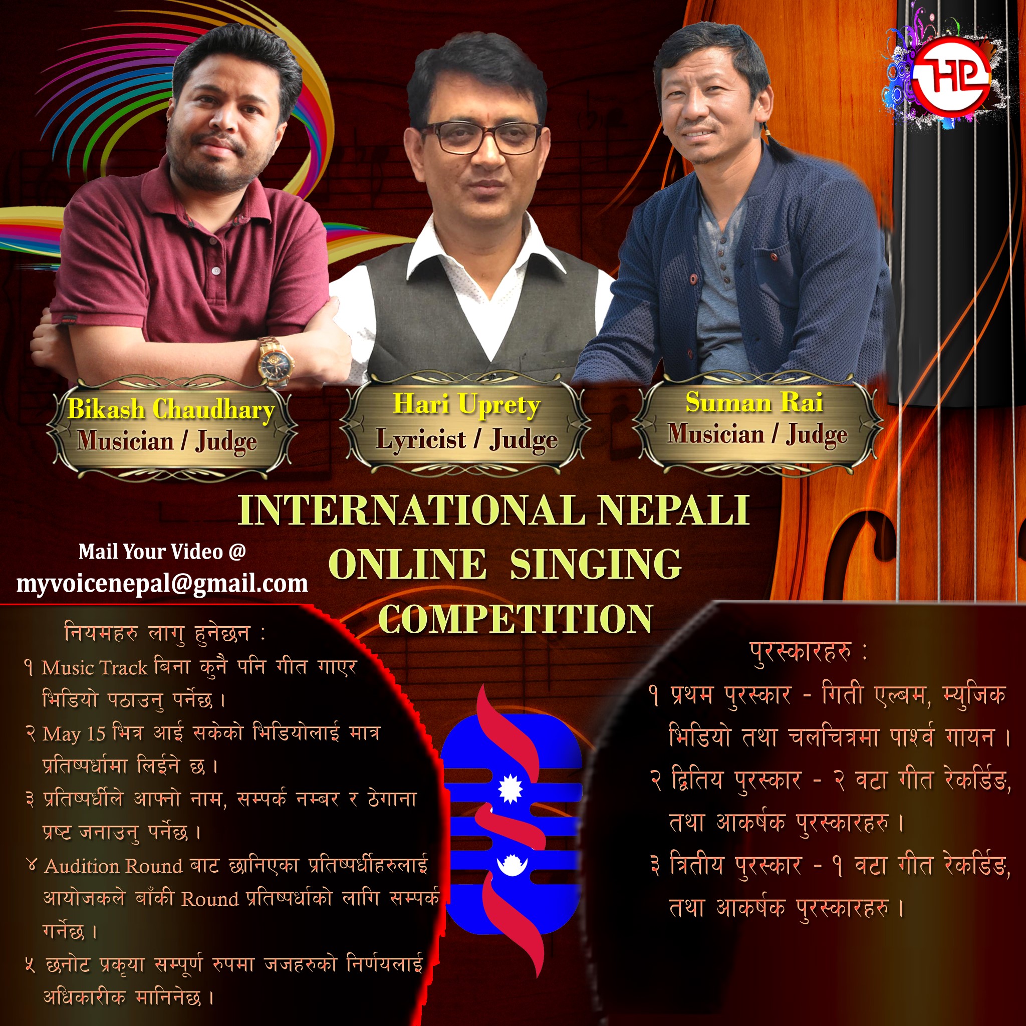 HP Entertainment को आयोजनामा इन्टरनेशनल नेपाली अन्लाइन सिङ्गगिङ्ग कम्पिटिसन हुने भएको छ। यही मे १५ बाट अन्लाइन सिङ्गिङ्ग प्रतियोगीता सुरु हुने कार्यक्रम आयोजक HP Entertainment ले जानकारी दिएको छ। संगीत सङ्ग आबद्ध रहनु हुने सबै नेपाली भाषी ब्याक्तित्वहरुले यो कार्यक्रममा सहभागी जनाउन सक्ने बताईएको छ।