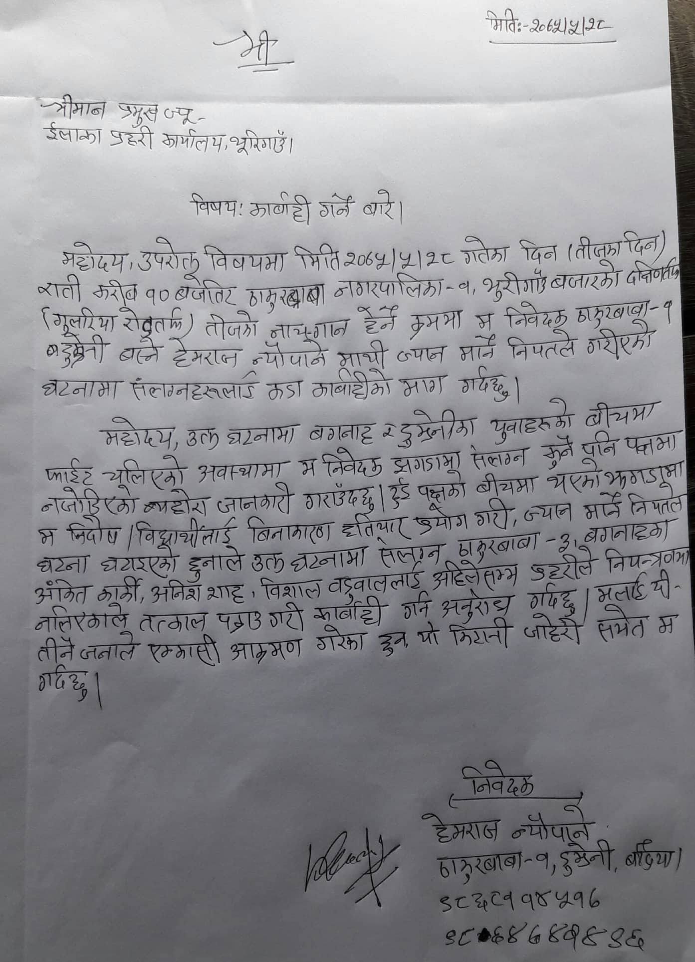 आक्रमण पछि पिडित हेमराज न्यौपानेले प्रहरी समक्ष कारवाहीको माग गर्दै निवेदन दिएका छन् । बगनाहा र डुम्रेनिका युवाहरु बिच भएको झगडा बिचमा पिडित हेमराज न्यौपाने माथि पनि आक्रमण भएको थियो ।