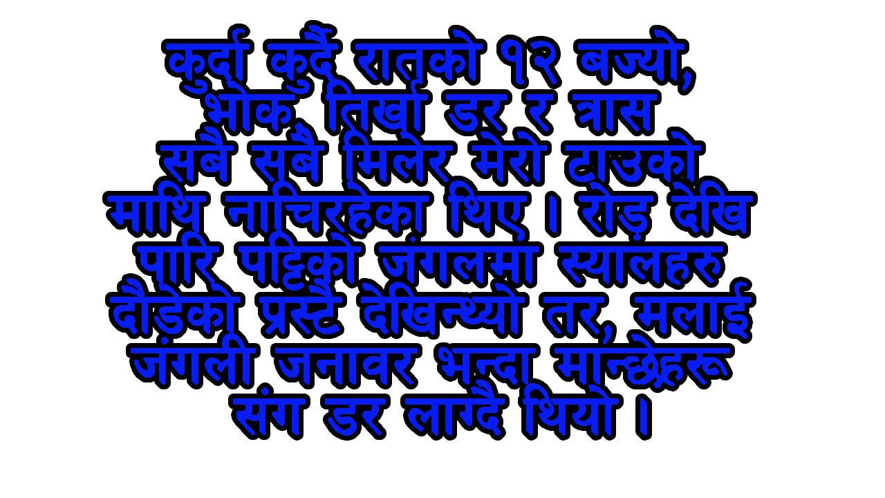 कुर्दा कुर्दै रातको १२ बज्यो, भोक, तिर्खा, डर र त्रास सबै, सबै मिलेर मेरो टाउको माथि नाचिरहेका थिए । रोड़ देखि पारि पट्टिको जंगलमा स्यालहरु दौडेको प्रस्ट देखिन्थ्यो तर, मलाई जंगली जनावर भन्दा मान्छेहरू संग डर लाग्दै थियो । किनकि बेलायतमा पनि लुटपाट र बलात्कारका घटनाहरू हुने गर्छन् बेलाबखत । घरबार बिहिन, ड्रग एडिकहरू भेटिन्छन् । त्यस्ता मान्छेहरू काम नगरी बस्छन्, दिनभरि सुत्छन् सरकारी भत्ता थाप्दै खान्छन्, अनि रातमा बाहिर निस्कन्छन् ।
