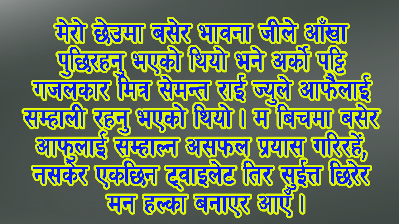 मज्जा मानी-मानी हेरि रहन्छु, हातमा भएको सबै चिट्ठी छिनभरमै बाँडीसकेर अर्को रोड तिर हाम्फाल्छ । म भने अझै मस्कारा समातेर अनुहारमा कुची चलाई रहन्छु ।अनि महशुस गर्छु हामी छोरी मान्छेले मेकअप गर्नमा कति धेरै समय खर्च गर्दा रहेछौं भनेर ।