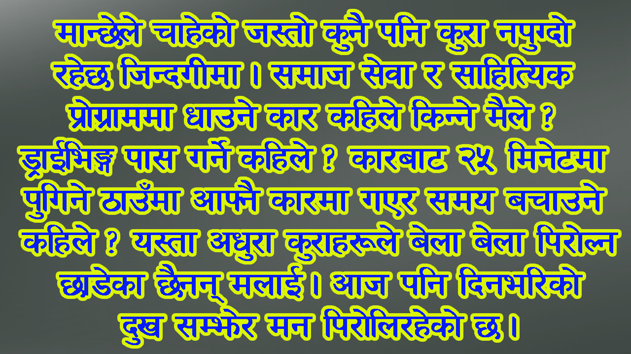 मान्छेले चाहेको जस्तो कुनै पनि कुरा नपुग्दो रहेछ जिन्दगीमा । समाज सेवा र साहित्यिक प्रोग्राममा धाउने कार कहिले किन्ने मैले ? ड्राईभिङ्ग पास गर्ने कहिले ? कारबाट २५ मिनेटमा पुगिने ठाउँमा आफ्नै कारमा गएर समय बचाउने कहिले ? यस्ता अधुरा कुराहरूले बेला बेला पिरोल्न छाडेका छैनन् मलाई । आज पनि दिनभरिको दु:ख सम्झेर मन पिरोलिरहेको छ ।