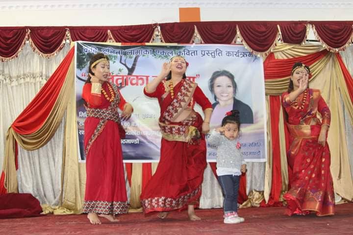 काठमाडौँ / कार्तिक १४ – काठमाडौँको धुम्बाराहीमा महिला सामुदायिक कार्यक्रम सञ्चालन समिति र महिला सामुदायिक केन्द्रद्वारा आयोजित एकल कविता वाचन कार्यक्रम ‘अनिताका कविता’मा कवि अनिता लामाले आफ्ना एक दर्जन बढी कविता सुनाइन् ।