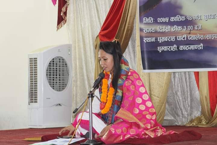 ‘अर्पण’ र ‘अनुराग’पछि हालै तेस्रो कविताकृति ‘आतुङ’ ल्याएकी उनले कार्यक्रममा ‘सलाम आदरणीय आमाबुबा’, ‘नागरिकता’ र ‘रगत’ शीर्षक कविता सुनाइन् । उनले आफ्ना कवितामा नारी शक्तिको प्रसंशा गर्दै समाजमा हुने राजनीतिक, सांस्कृतिक र प्रशासनिक विभेदप्रति व्यङ्ग्य गरिन् ।
