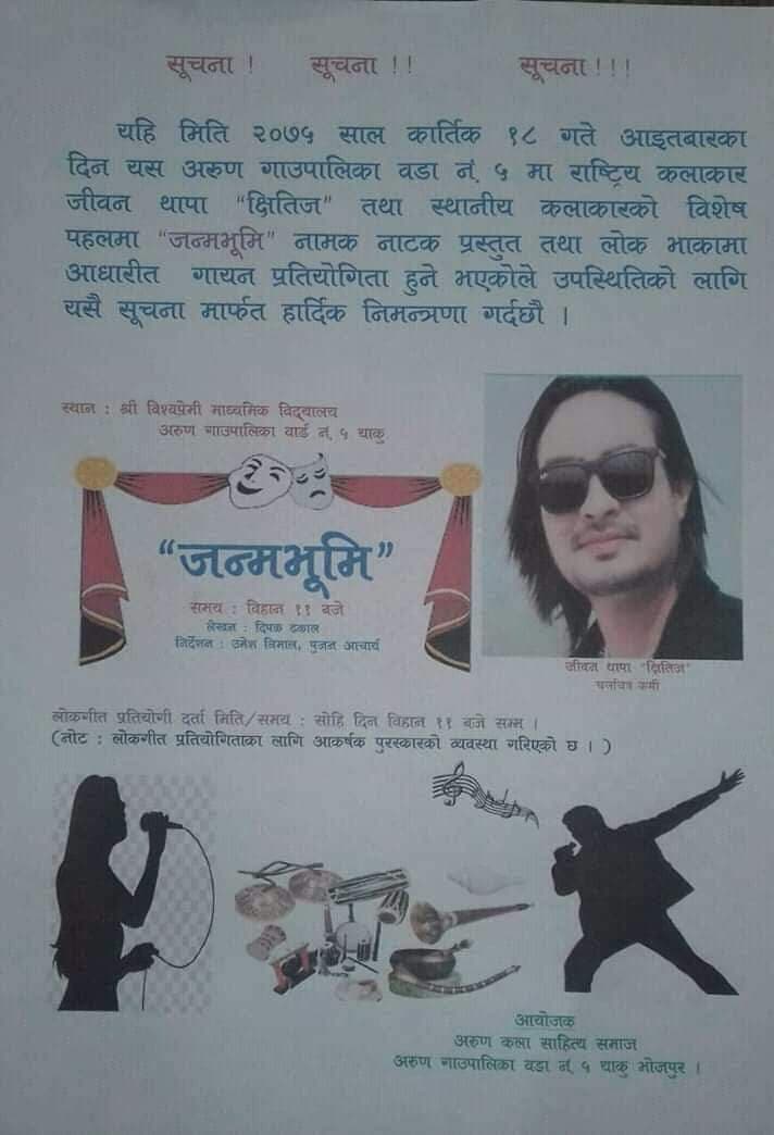 रङ्गकर्मी, चलचित्र कलाकार, नाटककार तथा निर्देशक जीवन थापा ‘क्षितिज’को परामर्श र उपस्थितिमा आयोजना हुने उक्त कार्यक्रममा दीपक ढकालद्वारा लिखित तथा उमेश धिमाल र पुजन आचार्यद्वारा निर्देशित अनि स्थानीय कलाकारद्वारा अभिनित सामाजिक नाटक ‘जन्मभूमि’ समेत मञ्चन गरिने आयोजक संस्थाले जनाएको छ । कार्यक्रम स्थानीय अरुण कला, साहित्य समाज अरुण गाउँपालिका–५ ले आयोजना गर्न लागेको हो ।