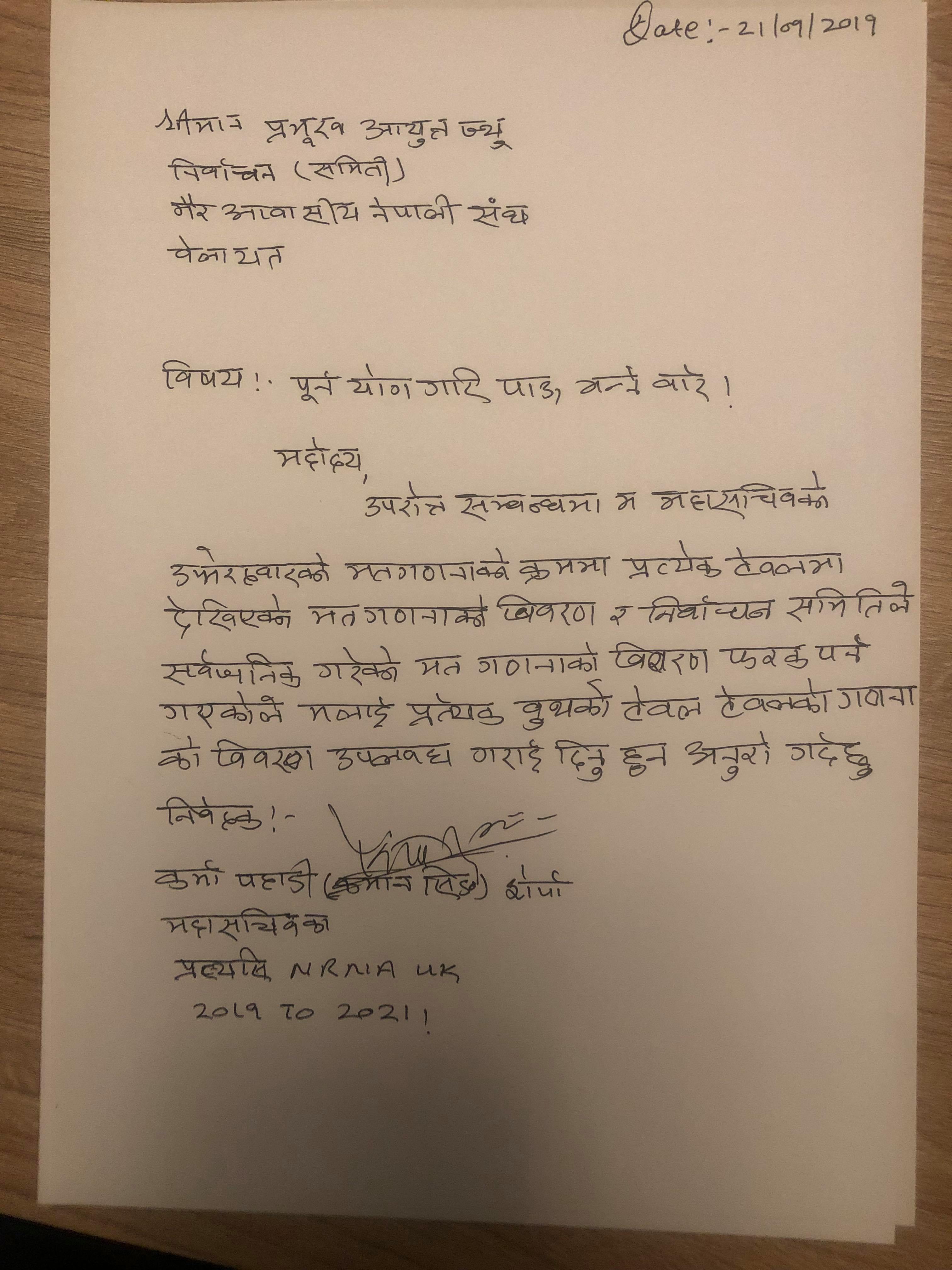 लन्डन – एनआरएनए युके महासचिब उम्मेरदवार कर्मा पहाडी शेर्पाले पुन मतगर्णना गरि पाउ भनि निबेदन दिदै शनिवार भएको एनआरएन युकेको निर्वाचन सम्बन्धमा भएका सहमति कार्यान्वयन गर्न पनि माग गरेका छन् |