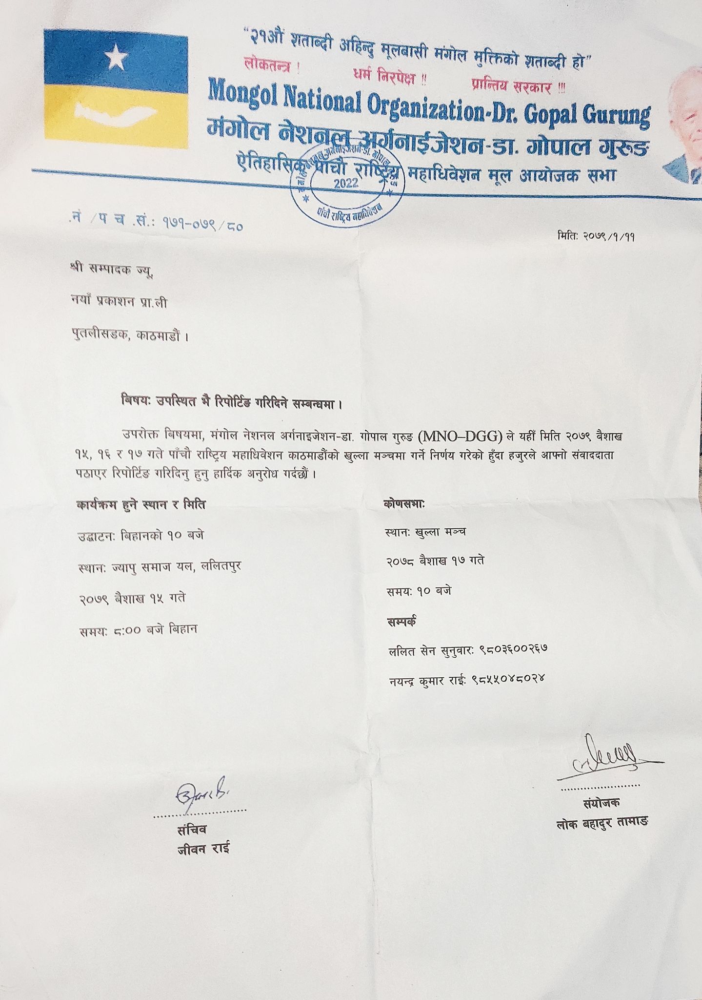 काठमाडौ – लोकतन्त्र, धर्म निरपेक्ष र प्रान्तीय सरकार भन्ने मूल नाराको साथ मंगोल नेशनल अर्गनाईजेशन डा.गोपाल गुरुङ (एमएनओ -डिजिजी) ले बैशाख १५,१६ र १७ गते राष्ट्रिय महाधिवेशन गर्ने भएको छ। उक्त महाधिवेशन काठमाडौको खुल्ला मन्चमा गर्ने भएको हो। मंगोल नेशनल अर्गनाईजेशन डा गोपाल गुरुङ (एमएनओ -डिजिजी) को यो पाँचौ राष्ट्रिय महाधिवेशन हो।
