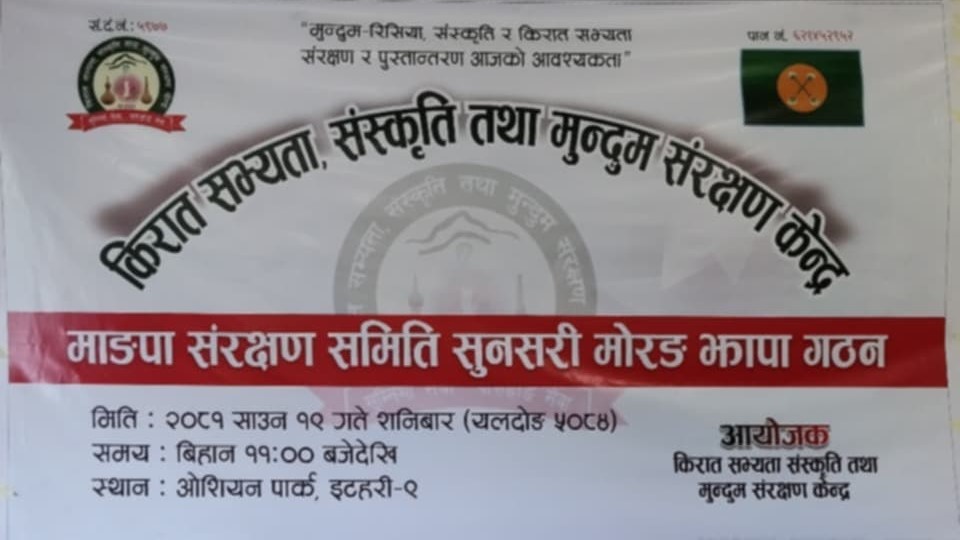 “मुन्दुम रिसिया,संस्कृति तथा किरात सभ्यता संरक्षण र पुस्तान्तरण आजको आवश्यकता” भन्ने मूल नाराका साथ माङ्पा / नछुङ विजुवाहरुको भेला सम्पन्न भएको छ। उक्त भेलाले सुनसरी मोरङ र झापा ३ जिल्लाका छुट्टाछुटै तदर्थ समिती समेत गठन गरेको छ।