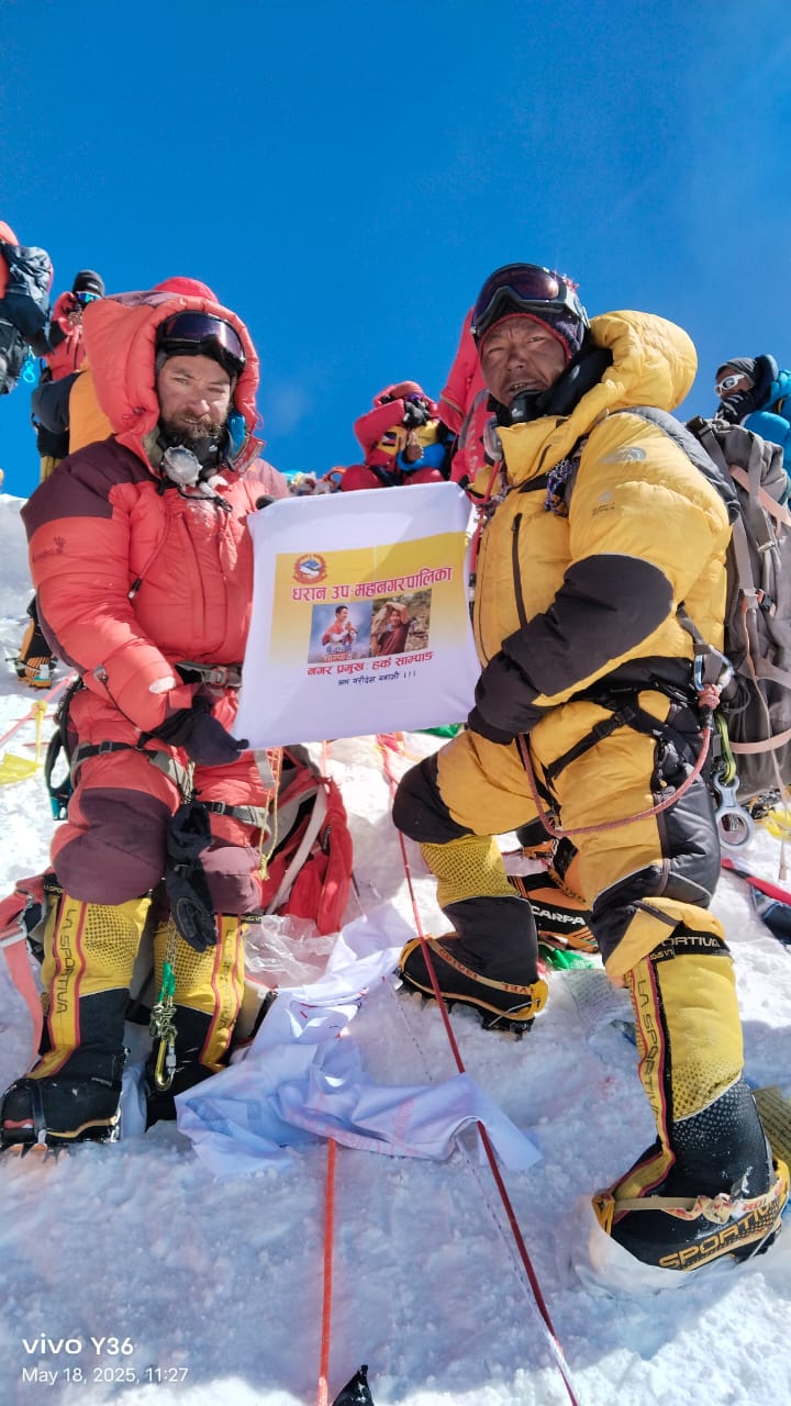काठमाडौ – धरान उप-महानगर पालिकाका मेयर हर्कराज राई (हर्क साम्पाङ्ग) को तस्विर सगरमाथाको चुचुरोमा पुगेको छ। सगरमाथा आरोही विजय घिमिरेले विक्रम संवत २०८२ जेठ ५ गते नेपाली समय बिहानको ८:५२ र चाइनाको समय ११:२७ बजे आइतबारका दिन विश्वको सर्वोच्च शिखर सगरमाथाको चुचुरोमा धरान उप-महानगर पालिकाको लोगो र नगर प्रमुख राईको तस्विर पुर्र्याएका हुन्।