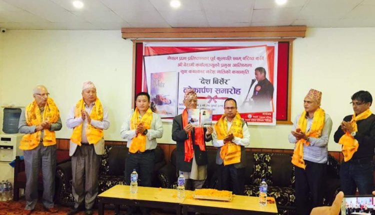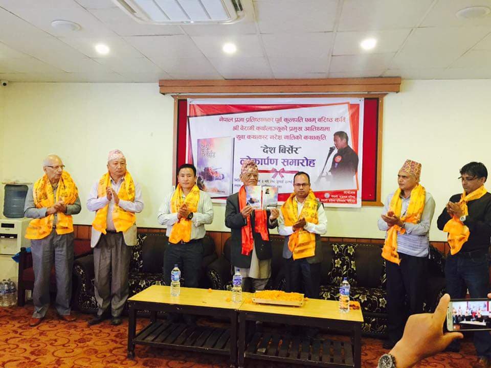 काठमाडौ – बागजबारस्थित होटल हार्दिकको संवित् सभा हलमा आयोजित एक समारोहमा नेपाल प्रज्ञा–प्रतिष्ठानका पूर्व कुलपति एवम् वरिष्ठ कवि बैरागी काइँलाले बेलायत बसोबास गर्दै आएका युवा स्रष्टा नरेश नातिद्वारा लिखित कथा सङ्ग्रह ‘देश बिर्सेर’को लोकापर्ण गरे ।