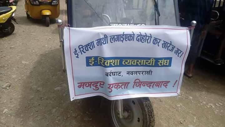 यसैको विरोधमा नवलपरासिको वर्दघाटमा ई-रिक्सा मजदुरहरुले विरोध जुलुस निकालेका छन् । चर्को कर, महंगी, मौलाउँदै गएको सामाजिक अपराध, पत्रकार र सञ्चार माध्यममा लादिएको वैधानिक हस्तक्षेपकारी नीति लगायतका विरोधमा नवलपरासीको वर्दघाटमा आज ई-रिक्सा मजदुरूले जुलुस निकालेका हुन् ।